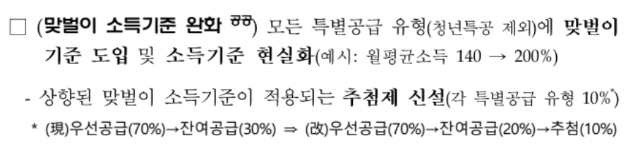 공공부문에서 청년특공을 제외한 모든 특공유형에 맞벌이 소득기준을 별도로 설정하고 맞벌이는 단독세대에 비해 1.2~1.4배정도였던 기준을 2배로 상향합니다. 이렇게 상향된 소득기준이 적용되는 추첨제도 신설한다고 합니다.