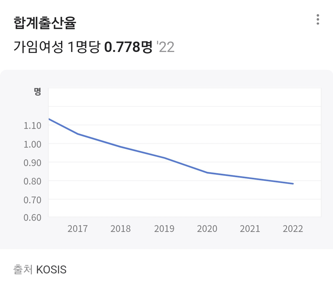 연도별 출산율을 검색해보면 바로 이런 그래프부터 나오게 됩니다. 22년 통계로 0.779명을 출산했습니다. 이거 엄청나게 심각한 상황입니다. 2.1명출산이어야 인구수가 그대로 유지되는 숫자거든요. 그 숫자에 33퍼센트밖에 되지 않습니다.